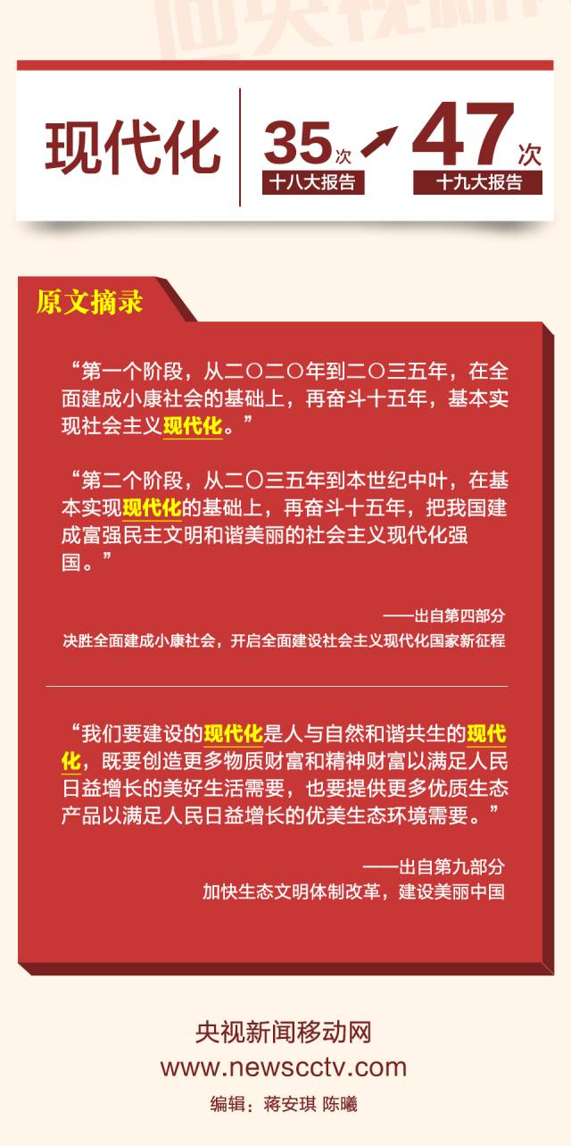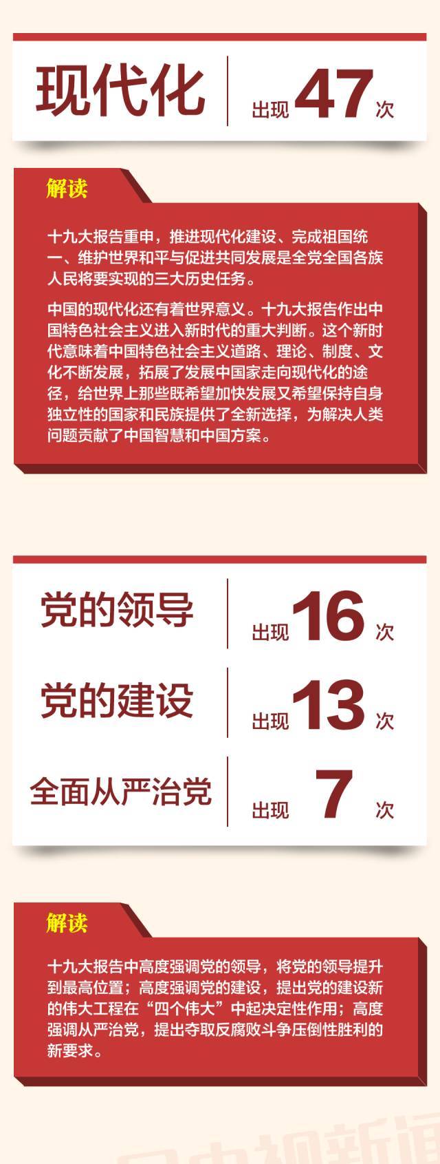 十九大報(bào)告中,許多重要關(guān)鍵詞被反復(fù)提及!靶聲r(shí)代”一詞首次出現(xiàn)在報(bào)告中,出現(xiàn)頻率也達(dá)到了30余次。此外,“中國(guó)特色社會(huì)主義”、“現(xiàn)代化”、“黨的領(lǐng)導(dǎo)”等詞也在報(bào)告中占據(jù)了重要的位置。