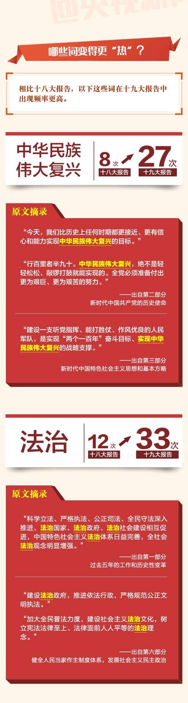 報(bào)告中哪些詞最“熱”,哪些詞預(yù)示了未來(lái)的發(fā)展方向?相比十八大報(bào)告,本次報(bào)告又有哪些全新的關(guān)鍵詞?問(wèn)題的答案盡在圖中↓↓↓