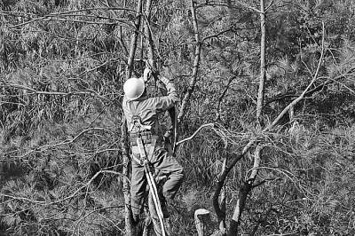 2月11日,為保障鐵路行車安全,中國鐵路南昌局集團公司南平工務段職工攀上離線路20米的歪斜危樹修剪樹枝。陽豆攝/光明圖片