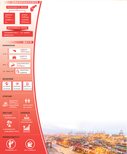 “穩(wěn)”主要體現(xiàn)在:自十八大以來,我國財政赤字率安排已連續(xù)四年增長且近兩年始終保持在3%的水平。穩(wěn)定赤字預(yù)期,鞏固近年來在管控地方政府債務(wù)方面取得的積極成效,并為未來中央宏觀調(diào)控預(yù)留充裕的財政空間!斑M”主要體現(xiàn)在:通過優(yōu)化財政支出結(jié)構(gòu),更多向創(chuàng)新驅(qū)動、“三農(nóng)”、民生等領(lǐng)域傾斜,實現(xiàn)精準扶持,主要體現(xiàn)為結(jié)構(gòu)性增支赤字。