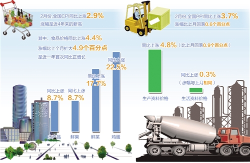 交通銀行首席經(jīng)濟學家連平分析認為,CPI同比上漲2.9%是近4年來的新高,也可能是今年年內的高位。今年春節(jié)假期全在2月,消費需求旺盛,與此同時,氣溫偏低影響食品生產(chǎn)供應。食品價格同比上漲4.4%,漲幅比上個月擴大4.9個百分點,是近一年來首次同比正增長。其中雞蛋、鮮菜、鮮果、水產(chǎn)品等食品價格大幅走高,同比漲幅分別達到22.5%、17.7%、8.7%、8.7%。此外,去年2月份CPI同比漲幅僅有0.8%,為全年最低,低基數(shù)對今年同期CPI有明顯的抬升作用。