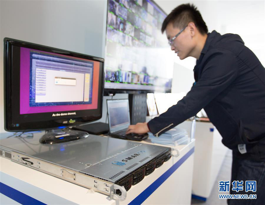 2017年12月,北京智能計(jì)算產(chǎn)業(yè)研究院舉行的發(fā)布會(huì)上,工作人員現(xiàn)場(chǎng)演示高通量人工智能一體機(jī)的應(yīng)用。(圖片來源:新華社)