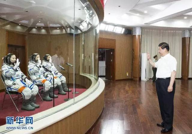 2013年6月11日,習(xí)近平來到酒泉衛(wèi)星發(fā)射中心為即將出征的航天員聶海勝、張曉光、王亞平壯行。(圖片來源:新華社)