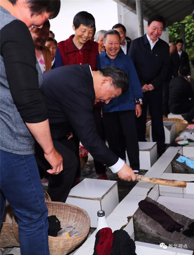 2018年4月24日下午,正在湖北宜昌調(diào)研考察的習近平總書記來到緊鄰三峽大壩的太平溪鎮(zhèn)許家沖村。正在村里洗衣服的幾位村民告訴總書記,過去是在江邊洗衣服,現(xiàn)在村里建起了便民洗衣池,污水集中處理,非常環(huán)保。總書記接過洗衣用的棒槌,俯下身試著捶打了幾下衣服。習近平表示,看見大家日子過得好,我高興!