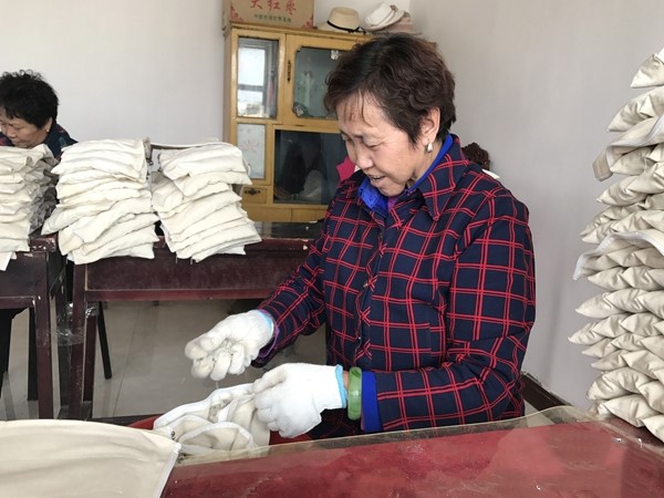 在青海省海西蒙古族藏族自治州烏蘭縣銅普鎮(zhèn)都蘭河村,村民在包裝鹽敷袋,一天可以掙上百元(5月15日攝)。