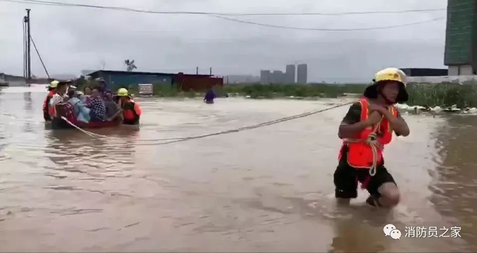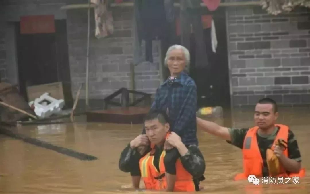 6月8日,受臺風“艾云尼”外圍影響,江西省泰和縣境內(nèi)普降暴雨,造成水位暴漲,這位老人因左腿有疾行動不便,沖鋒舟無法靠近,為了不使她身上被水弄濕,消防戰(zhàn)士讓其騎在肩上,徒步趟過齊胸深的洪水。