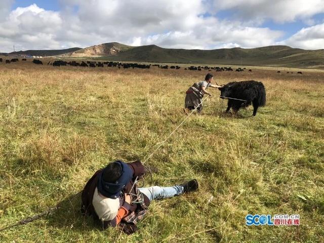采訪團(tuán)隊(duì)第一次和撲爾洼甲碰面是在若爾蓋縣城外的一片大草原上,當(dāng)時(shí)的他恰巧在和牧民一起采取牛絨。在草原上騎著高大的駿馬,疾馳中套住瘋攢的牦牛,然后一個(gè)抱摔將一頭重量超過(guò)一噸的牦牛撂倒在地,三下五除二就采下了一大捧牛絨。