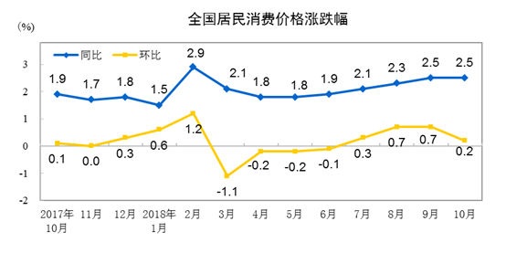 2018年10月份,全國(guó)居民消費(fèi)價(jià)格同比上漲2.5%。其中,城市上漲2.5%,農(nóng)村上漲2.6%;食品價(jià)格上漲3.3%,非食品價(jià)格上漲2.4%;消費(fèi)品價(jià)格上漲2.8%,服務(wù)價(jià)格上漲2.1%。1-10月平均,全國(guó)居民消費(fèi)價(jià)格比去年同期上漲2.1%。