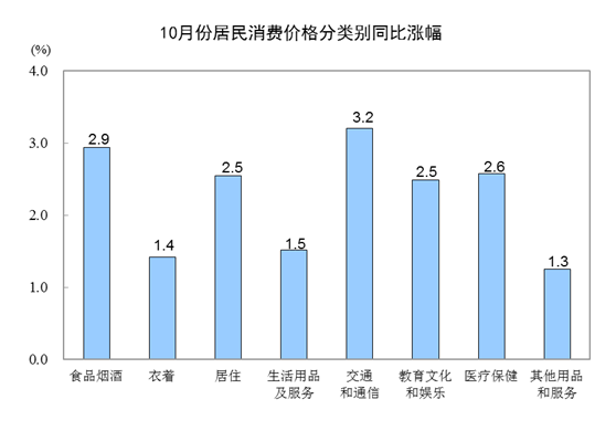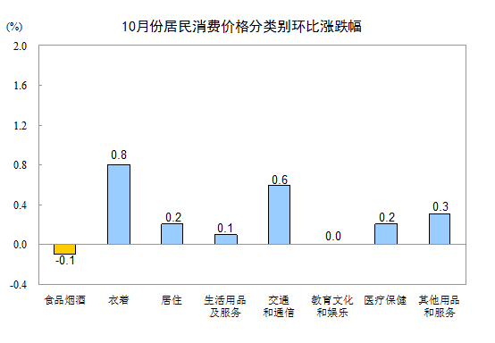 10月份,全國(guó)居民消費(fèi)價(jià)格環(huán)比上漲0.2%。其中,城市上漲0.2%,農(nóng)村上漲0.2%;食品價(jià)格下降0.3%,非食品價(jià)格上漲0.3%;消費(fèi)品價(jià)格上漲0.3%,服務(wù)價(jià)格持平。