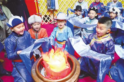 孩子們體驗(yàn)蒙古族小年祭火儀式。