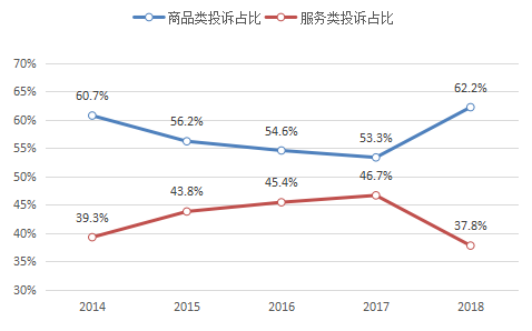 一是商品投訴比重?cái)U(kuò)大。2018年,全國(guó)市場(chǎng)監(jiān)管部門共受理商品投訴231.81萬(wàn)件,占比62.2%,同比增長(zhǎng)61.3%,服務(wù)投訴140.75萬(wàn)件,占比37.8%,同比增長(zhǎng)12.1%。商品投訴主要集中在日用百貨、食品、家用電器、交通工具、通訊器材等領(lǐng)域。服務(wù)投訴主要集中在遠(yuǎn)程購(gòu)物、居民服務(wù)、互聯(lián)網(wǎng)服務(wù)、文化娛樂服務(wù)、修理維護(hù)服務(wù)等領(lǐng)域。