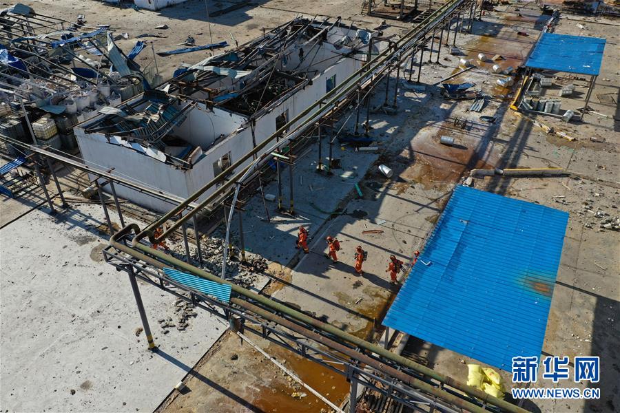 3月22日,消防隊員在江蘇鹽城響水化工廠爆炸事故現(xiàn)場搜救(無人機(jī)拍攝)。 新華社記者 季春鵬 攝