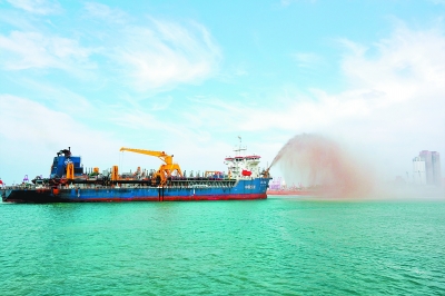 斯里蘭卡科倫坡港口城項(xiàng)目是中斯兩國(guó)在“一帶一路”建設(shè)中務(wù)實(shí)對(duì)接的重點(diǎn)項(xiàng)目,由中國(guó)交通建設(shè)股份有限公司與斯里蘭卡政府共同開(kāi)發(fā)。圖為項(xiàng)目施工現(xiàn)場(chǎng),一艘中國(guó)耙吸挖泥船正在吹沙。新華社發(fā)