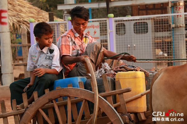 皎勃東地區(qū)的村民趕著牛車來(lái)中緬油氣管道項(xiàng)目援建的水井打水(洪荃詮 攝)