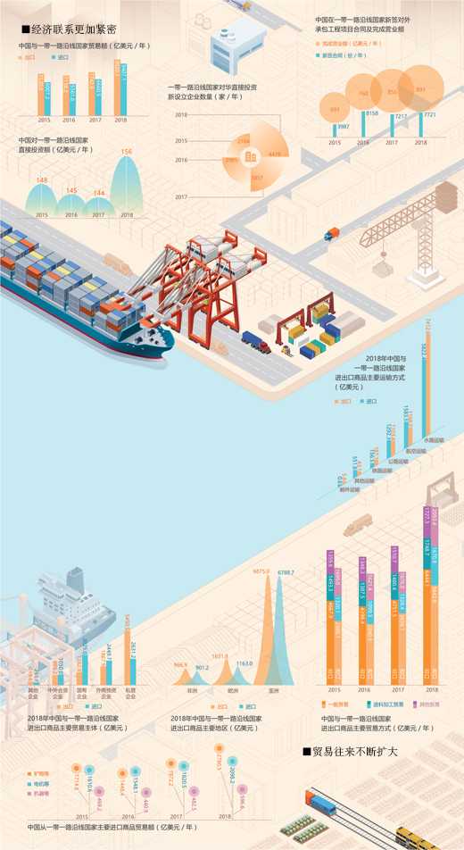 目前,我國已與126個國家和29個國際組織簽署“一帶一路”合作文件,“六廊六路多國多港”合作為主線的硬聯(lián)通國際合作不斷深入。我國企業(yè)在“一帶一路”沿線國家建設了一批境外經(jīng)貿(mào)合作區(qū),累計投資超過300億美元,帶動東道國就業(yè)近30萬人,給當?shù)仄胀癖妿韺崒嵲谠诘墨@得感。2013年至2018年,我國與“一帶一路”沿線國家貨物貿(mào)易總額超過6萬億美元,我國企業(yè)對“一帶一路”沿線國家直接投資超過900億美元。