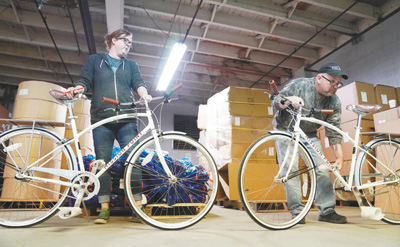 近期,美國政府在一片反對聲中再度升級對華貿(mào)易爭端,對中國輸美商品加征關(guān)稅,這讓高度依賴中國供應(yīng)商的美國自行車廠商叫苦不迭,給美國相關(guān)行業(yè)發(fā)展蒙上陰影。圖為5月21日,工作人員在美國密歇根州底特律市一家自行車廠工作。