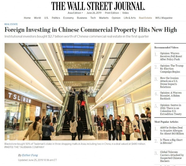 外資對中國商業(yè)地產投資創(chuàng)新高。圖片來源:《華爾街日報》報道截圖