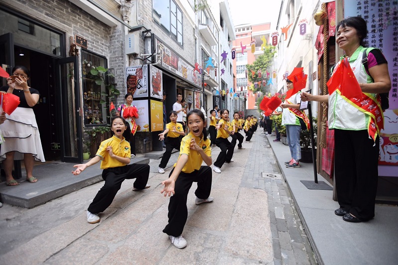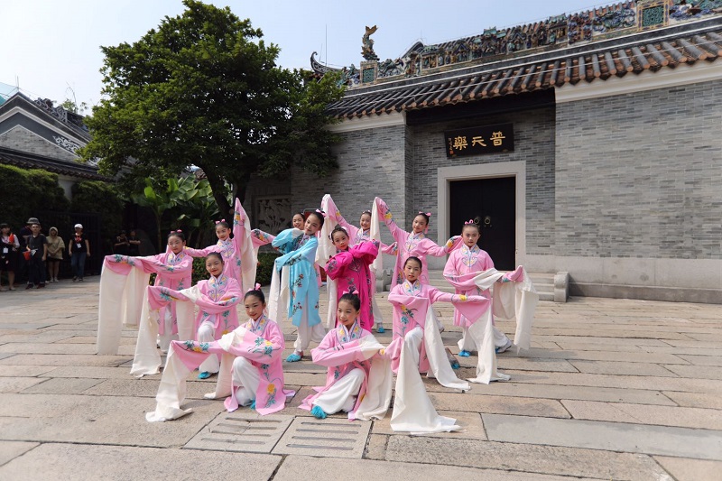 24日下午,在廣州粵劇藝術(shù)博物館、永慶坊等歷史建筑周邊拉開了一場快閃活動。一群身穿粵劇衣服的小朋友們甩著水袖、踏著蓮步出場;顒邮紫仍诨泟∷囆g(shù)博物館普樂天廣場前拉開序幕,由來自荔灣區(qū)青少年宮的小演員們表演原創(chuàng)曲目《小小水袖展芳菲》,現(xiàn)場吸引了眾多游客。其余四個快閃地點分別為鑾輿堂、李小龍祖居、八和會館、永慶坊二期金聲廣場。來自粵劇藝術(shù)博物館少兒傳承基地的小演員和荔灣區(qū)五眼橋小學的學子也參與了快閃表演,包括粵劇、武術(shù)、紅歌表演等。