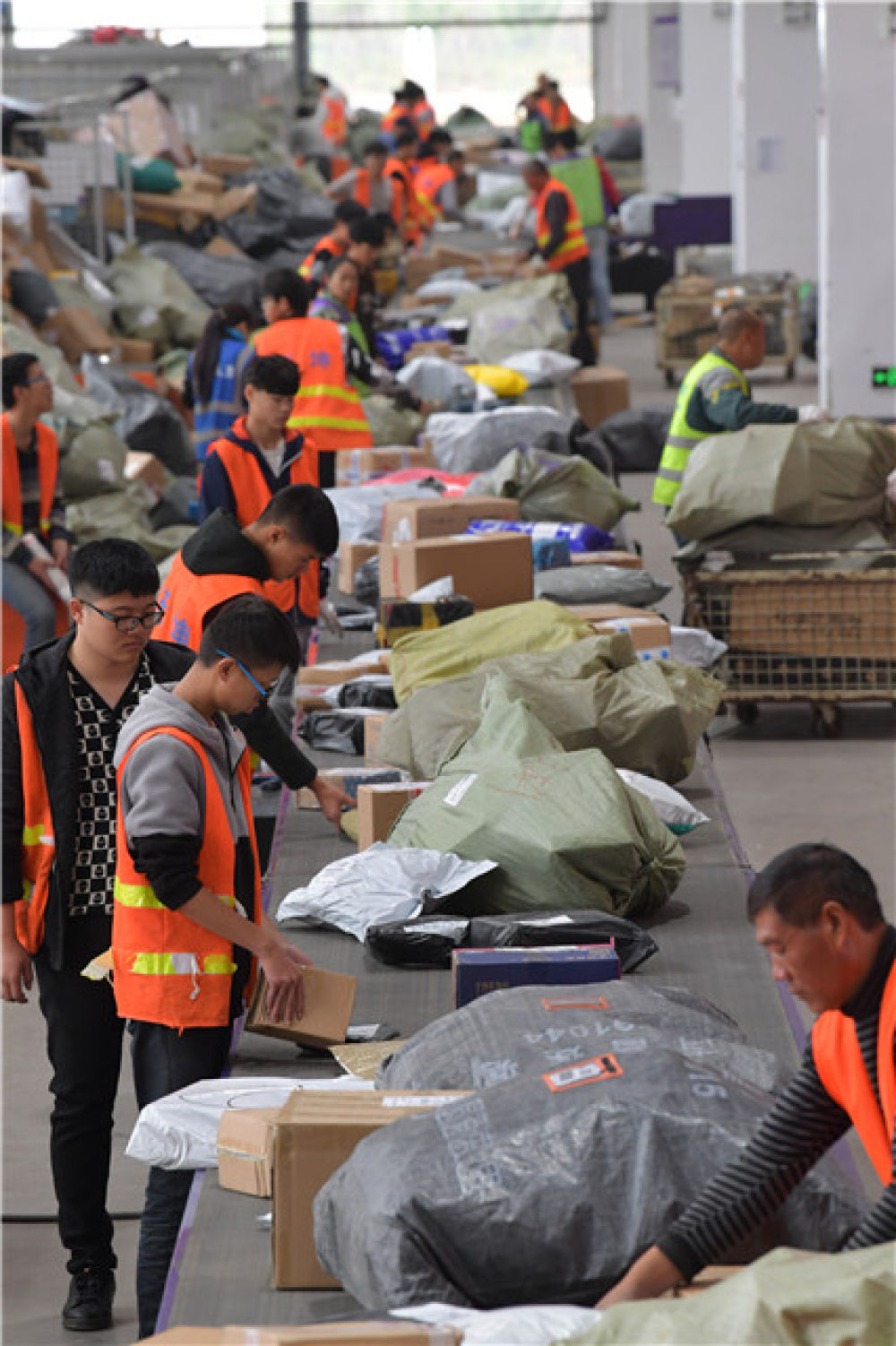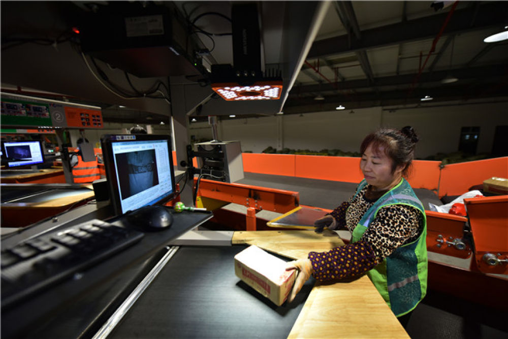 在貴州省龍里縣一快遞公司的自動化分揀車間,揀配員在流水線上工作(2018年11月13日攝)。新華社發(fā)(龍毅 攝)