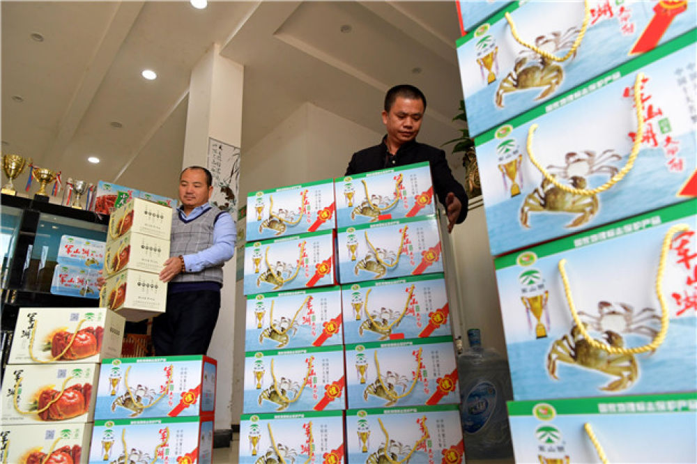 在江西省進賢縣軍山湖大閘蟹線上銷售網點,工作人員準備將裝箱的大閘蟹發(fā)貨給網購的顧客(2018年11月9日攝)。新華社記者 彭昭之 攝
