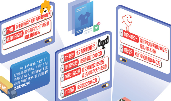 “剁手黨”們的消費能力“逆天”了!在今年的“雙11”電商大促中,天貓只花了1分36秒,成交額就突破百億元,11日凌晨1時3分59秒,總成交額超過1000億元,16時31分12秒,成交額超過2135億元,已超過2018年“雙11”全天成交額。