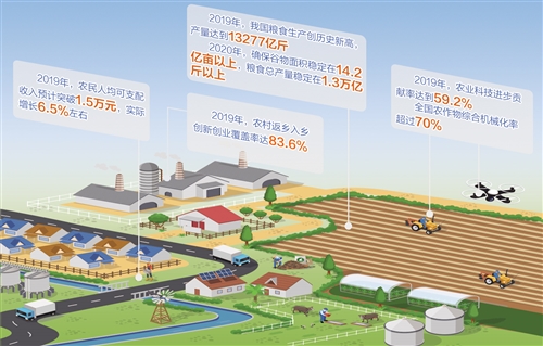 2019年,我國農(nóng)業(yè)農(nóng)村發(fā)展實現(xiàn)穩(wěn)中有進。糧食生產(chǎn)創(chuàng)歷史新高,產(chǎn)量達到13277億斤,連續(xù)5年站穩(wěn)1.3萬億斤臺階;農(nóng)民收入增速繼續(xù)高于城鎮(zhèn)居民,農(nóng)民人均可支配收入預(yù)計突破1.5萬元?傮w看,鄉(xiāng)村振興扎實推進,為穩(wěn)定經(jīng)濟社會大局提供了有力支撐。2020年的農(nóng)業(yè)農(nóng)村工作,要以鄉(xiāng)村振興戰(zhàn)略為總抓手,重點圍繞保供給、保增收、保小康展開。