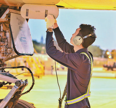 10日,機(jī)務(wù)人員進(jìn)行起飛前的各項(xiàng)檢查。當(dāng)日,?诿捞m機(jī)場(chǎng)飛往北京大興機(jī)場(chǎng)的首個(gè)航班順利起航。