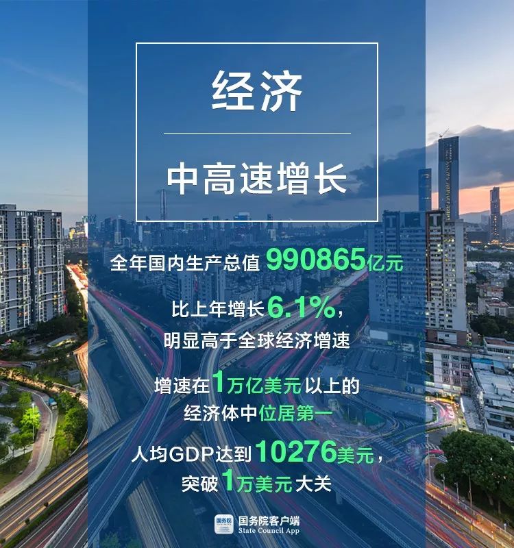 國家統(tǒng)計局1月17日上午公布2019年國民經(jīng)濟運行情況數(shù)據(jù),初步核算,全年國內(nèi)生產(chǎn)總值990865億元,年末中國大陸總?cè)丝?40005萬人,人均國內(nèi)生產(chǎn)總值10276美元,經(jīng)濟運行總體平穩(wěn),發(fā)展主要預(yù)期目標(biāo)較好實現(xiàn)。