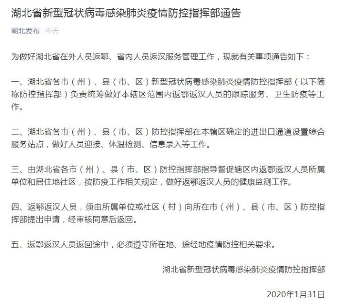 通告還稱,返鄂返漢人員返回途中,必須遵守所在地、途經地疫情防控相關要求。