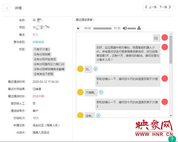 自1月25日以來,街道組織300余人,通過兩天時間對轄區(qū)4.29萬戶家庭10.5萬人進行了入戶排查。為避免排查時期有人員外出導(dǎo)致遺漏等情況,進一步建全建細檔案臺賬,街道使用AI人工智能外呼平臺,導(dǎo)入社區(qū)居民信息,對全部居民進行二次電話排查,每次排查居民僅需回答“是”或者“不是”等簡單語言即可完成身份信息、活動區(qū)域、接觸人群、癥狀等信息的排查,AI排查結(jié)果與前期排查進行比對,提高了排查工作的效率和質(zhì)量。