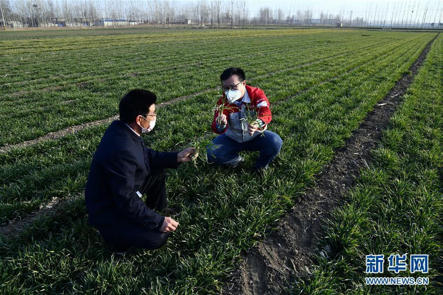 2月13日,在山東省泰安市寧陽(yáng)縣葛石鎮(zhèn)大夏莊村,豐信公司工作人員(右)在為提供“保姆式”服務(wù)的農(nóng)戶傳授小麥管理知識(shí)。新華社記者 郭緒雷 攝