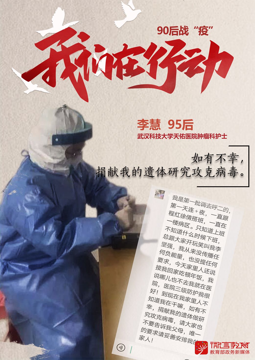 李慧在醫(yī)院征集志愿者時,給護理部發(fā)了一段話,要求到任務較重的呼吸二病區(qū)參與一線工作,并要求不要告知家人。