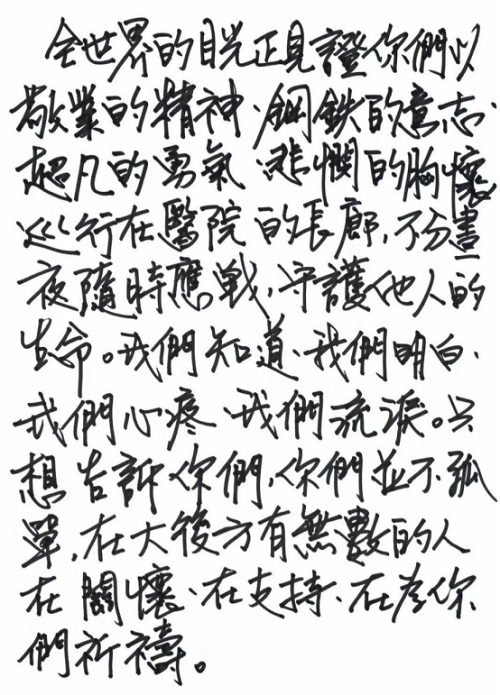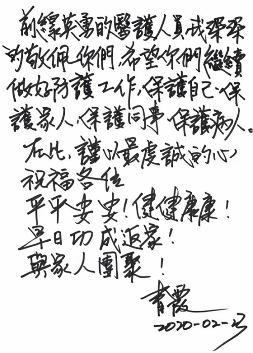 3月初,華中科技大學(xué)同濟(jì)醫(yī)學(xué)院附屬同濟(jì)醫(yī)院收到了一份捐助,共計(jì)2000副醫(yī)用手套,還有一封用繁體字書(shū)寫(xiě)的信,署名是青霞。