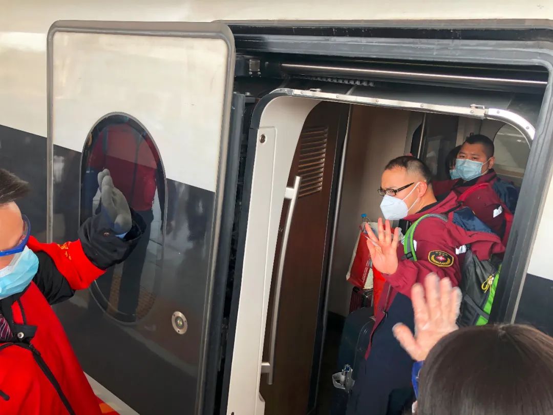 武漢站,即將返回的貴州、湖南醫(yī)療隊(duì)隊(duì)員也受到了武漢市和鐵路工作人員的夾道歡迎。