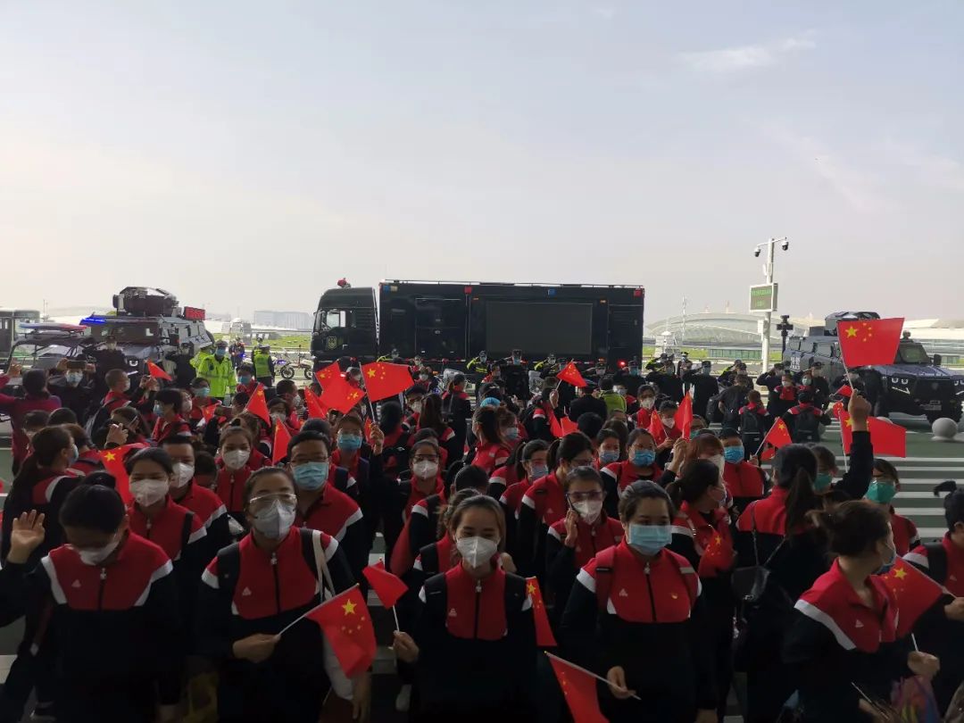 準(zhǔn)備凱旋的海南國家緊急醫(yī)學(xué)救援隊(duì)高喊“武漢加油,中國加油!”