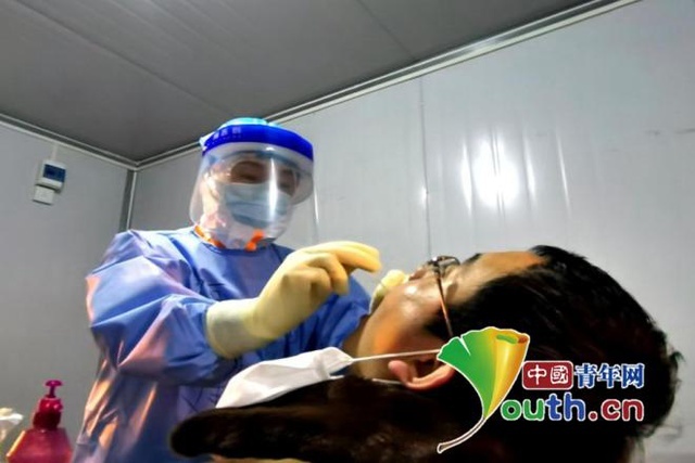 雷樂鶯給患者做咽拭子采集,圖片來自:中國(guó)青年網(wǎng)