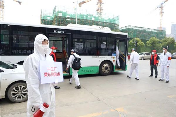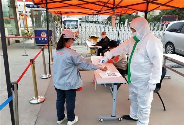 蘇泊爾武漢基地工作人員正在對乘坐“點對點”“一站式”返崗暖心專車返回復工的工人們測量體溫,做好健康登記。(武漢市漢陽區(qū)紀委監(jiān)委供 汪明星 攝)