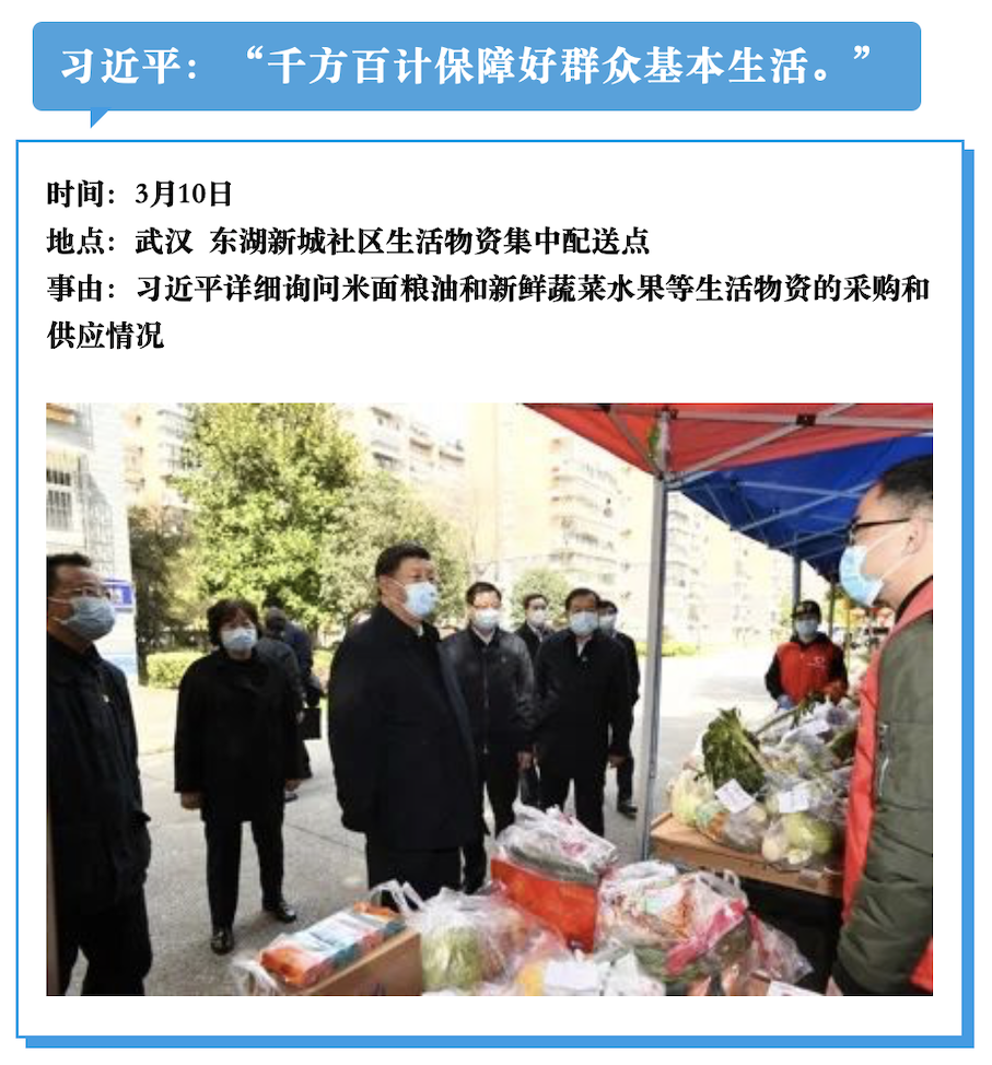 3月10日,習近平來到武漢東湖新城社區(qū)調(diào)研。大家告訴總書記,社區(qū)居民們都想知道什么時候武漢能解封!拔抑,大家都在掐著指頭算呢!笨倳浾f,“盡管武漢的疫情形勢逐步向好,但總體上看還沒有到可以松口氣的時候。這是一場人民戰(zhàn)爭,需要全體人民堅定信心、同舟共濟。堅持就是勝利。請大家再堅持一下!”