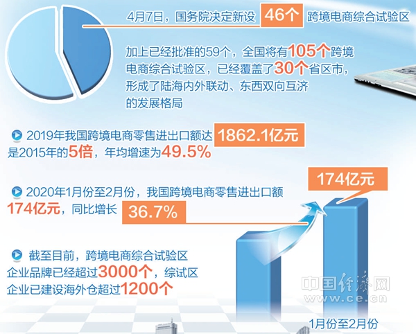 疫情發(fā)展并未影響我國(guó)跨境電商綜合試驗(yàn)區(qū)再次擴(kuò)圍。4月7日,國(guó)務(wù)院決定新設(shè)46個(gè)跨境電商綜合試驗(yàn)區(qū),加上已經(jīng)批準(zhǔn)的59個(gè),全國(guó)將擁有105個(gè)跨境電商綜合試驗(yàn)區(qū),已經(jīng)覆蓋了30個(gè)省區(qū)市,形成了陸海內(nèi)外聯(lián)動(dòng)、東西雙向互濟(jì)的發(fā)展格局。