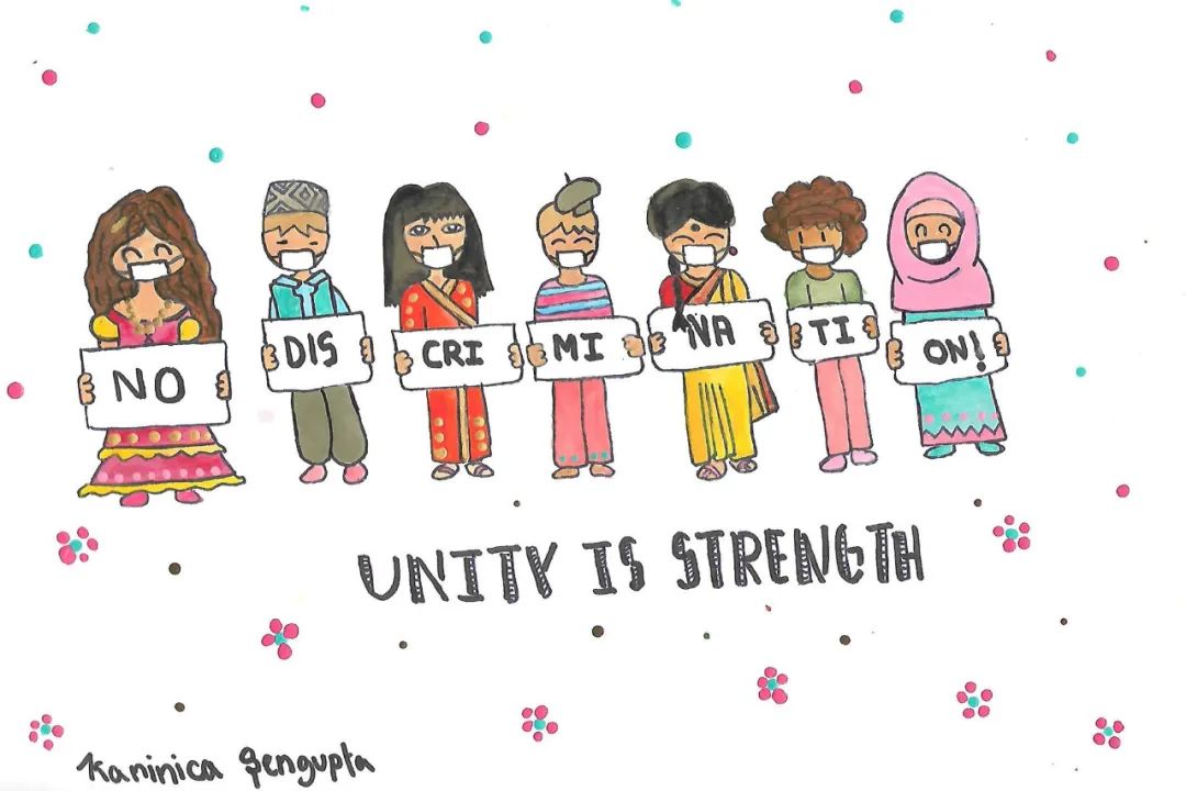 兒基會圖片丨來自印度的12歲女孩卡尼妮卡繪制的畫作,呼吁杜絕歧視,團結抗疫