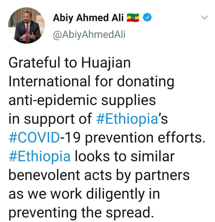 △3月21日,埃塞總理阿比在社交媒體上感謝華堅(jiān)集團(tuán)為當(dāng)?shù)鼐栀?zèng)抗疫物資