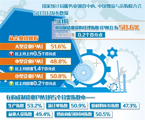 5月份,制造業(yè)PMI為50.6%,比上個(gè)月小幅回落0.2個(gè)百分點(diǎn),但連續(xù)3個(gè)月處于榮枯線上方。在制造業(yè)采購經(jīng)理調(diào)查企業(yè)中,81.2%的企業(yè)已達(dá)到正常生產(chǎn)水平的八成以上。