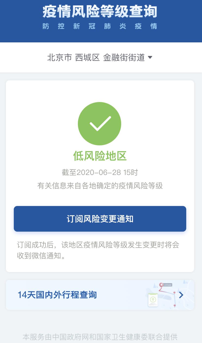 國務(wù)院客戶端小程序“疫情風險等級查詢”上顯示,截至6月28日15時,北京市西城區(qū)金融街街道、豐臺區(qū)太平橋街道由疫情中風險地區(qū)變更為低風險地區(qū)。
