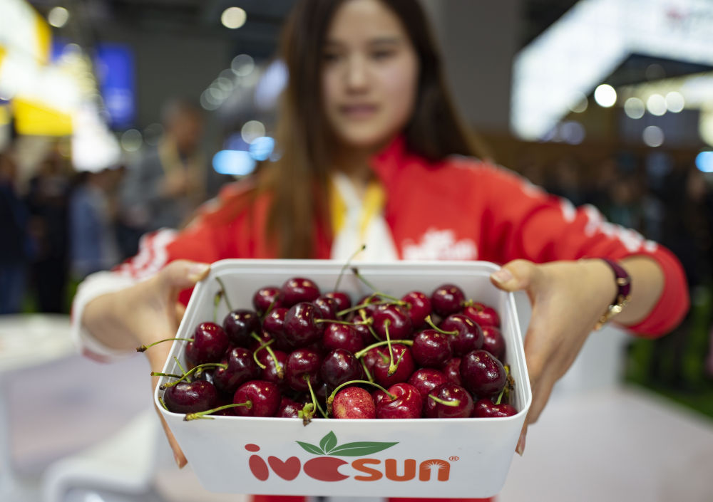 ▲第二屆進(jìn)博會(huì)上,工作人員在食品及農(nóng)產(chǎn)品展區(qū)展示智利車(chē)?yán)遄印?/p>