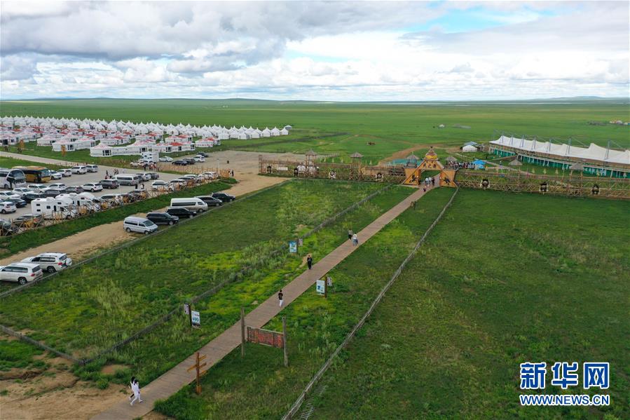 8月4日,游客在呼倫貝爾新巴爾虎左旗的民俗旅游度假景區(qū)游玩(無人機(jī)照片)。 新華社記者 徐欽 攝