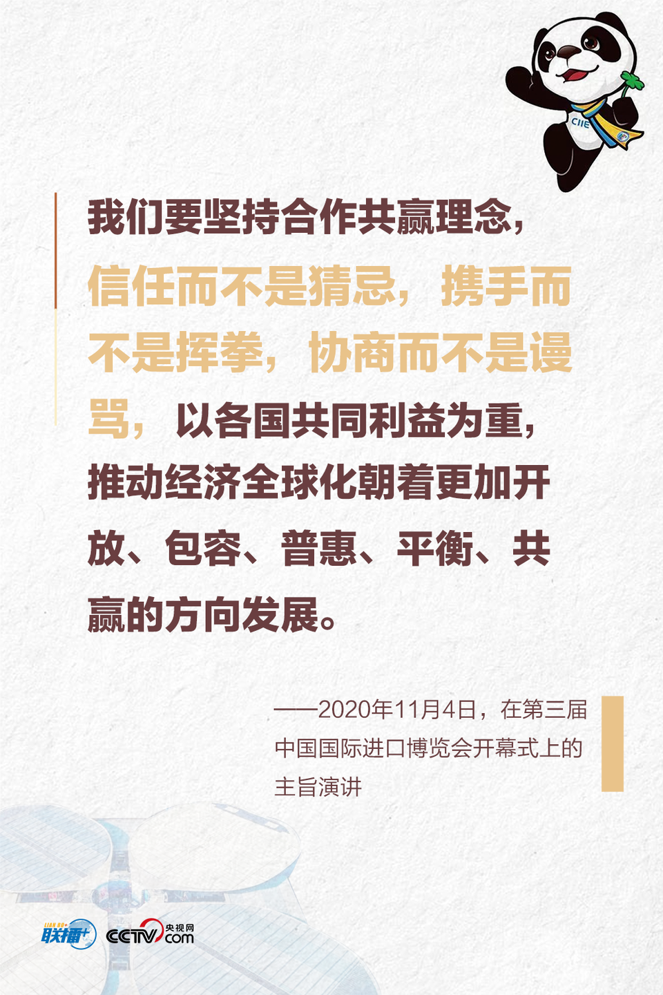 “要堅持合作共贏理念,信任而不是猜忌,攜手而不是揮拳,協(xié)商而不是謾罵,以各國共同利益為重,推動經(jīng)濟全球化朝著更加開放、包容、普惠、平衡、共贏的方向發(fā)展”,“各國走向開放、走向合作的大勢沒有改變”。