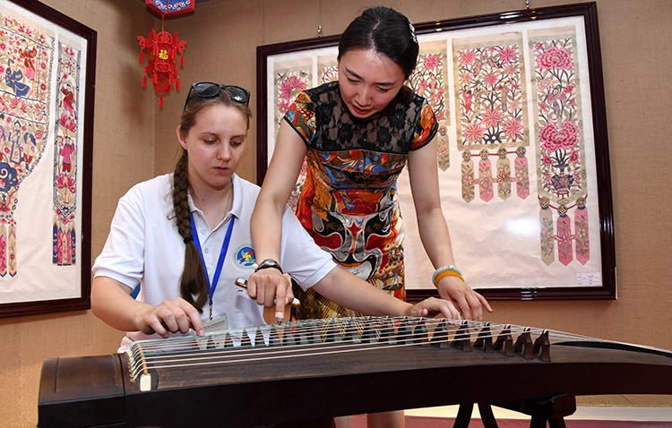 2018年7月17日,第三屆上海合作組織青年交流營的營員在青島參加了一場別開生面的民俗互動體驗活動,感受中國傳統(tǒng)文化。這是來自哈薩克斯坦的薩莎(左)在學習古箏彈奏。