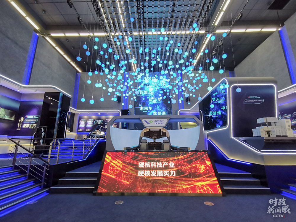 △中國(guó)商飛展區(qū)。2017年5月,我國(guó)首架具有完全自主知識(shí)產(chǎn)權(quán)的大型噴氣式客機(jī)C919在浦東國(guó)際機(jī)場(chǎng)首飛成功,中國(guó)商飛公司是這架飛機(jī)的主制造商。(總臺(tái)央視記者王冰拍攝)
