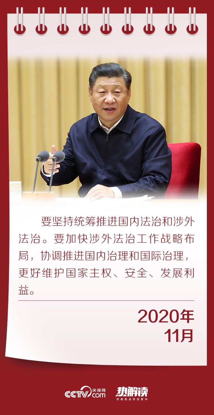 “協(xié)調(diào)推進國內(nèi)治理和國際治理”“強化法治思維”“運用法治方式”“推動全球治理變革”“推動構(gòu)建人類命運共同體”……此次會議中,談及涉外法治工作戰(zhàn)略布局,總書記又從全局高度作出許多深刻闡述。