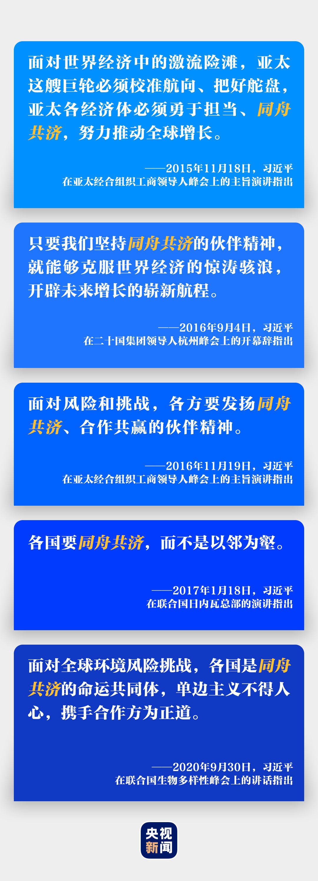 兩年前的11月17日,習(xí)近平出席亞太經(jīng)合組織工商領(lǐng)導(dǎo)人峰會(huì),在主旨演講中,他強(qiáng)調(diào)“我們同在一條船上,一起謀劃發(fā)展合作,具有特別的意義”,提出要“握穩(wěn)舵盤、把準(zhǔn)航向、齊力劃槳、乘風(fēng)破浪”。他還多次在多邊組織峰會(huì)、聯(lián)合國系列高級(jí)別會(huì)議等場合呼吁“同舟共濟(jì)”。